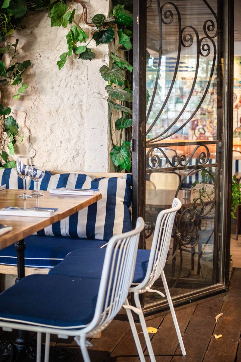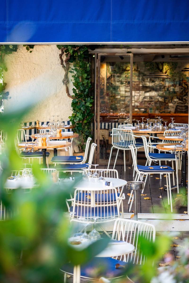 Les matériaux — bois de chêne clair, métal, fer forgé — dialoguent avec un mobilier blanc et bleu sélectionné avec soin, pour composer une atmosphère à la fois accueillante, simple et élégante. La terrasse prolonge l’expérience, ouverte sur l’effervescence du quartier, tout en conservant une ambiance fraîche et paisible.