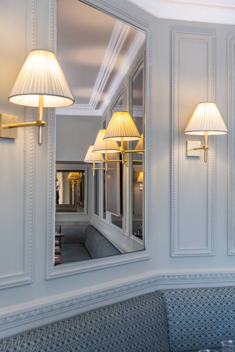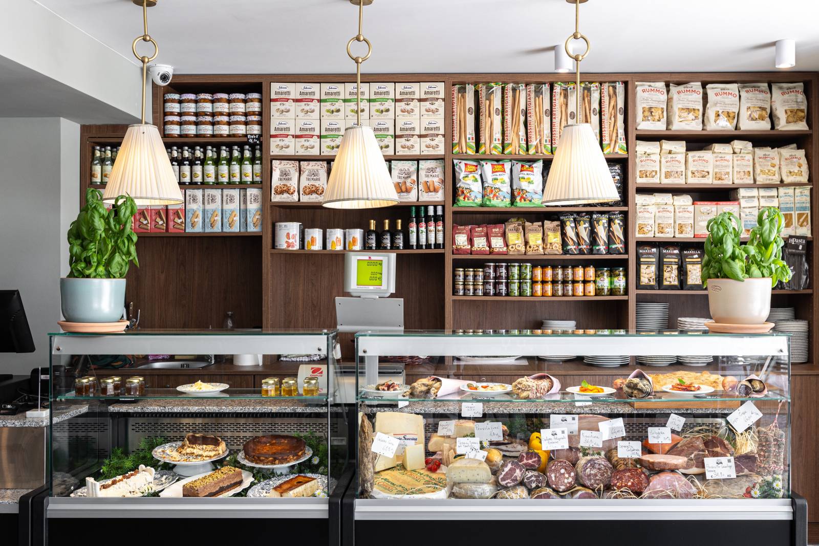 À l’intérieur, le décor évoque les codes classiques des trattorias italiennes : sol en mosaïque type bistrot, moulures en plâtre, miroirs, appliques en laiton, abat-jour en tissu… L’atmosphère est chaleureuse, vivante, sans artifice. Un grand bar structure le fond de salle, tandis qu’un comptoir de vente à emporter accueille une épicerie fine italienne mettant en valeur des produits soigneusement sélectionnés : pâtes artisanales, sauces maison, charcuteries à la coupe, fromages affinés.