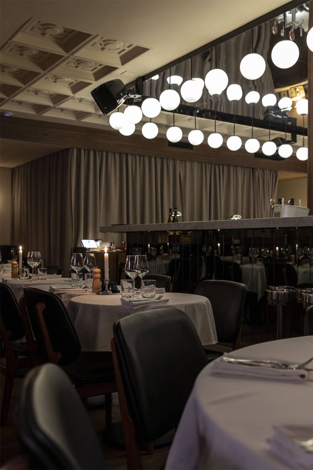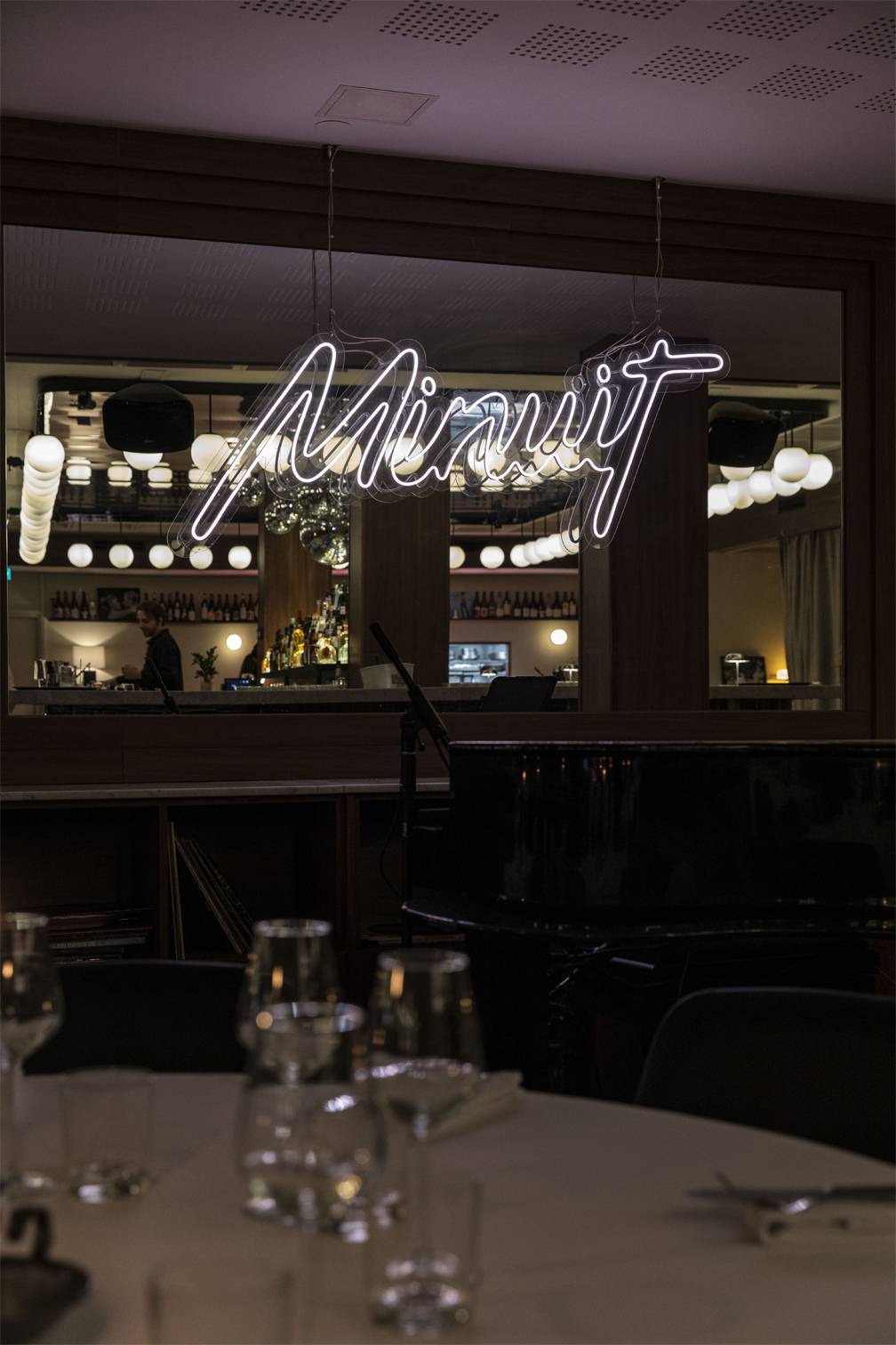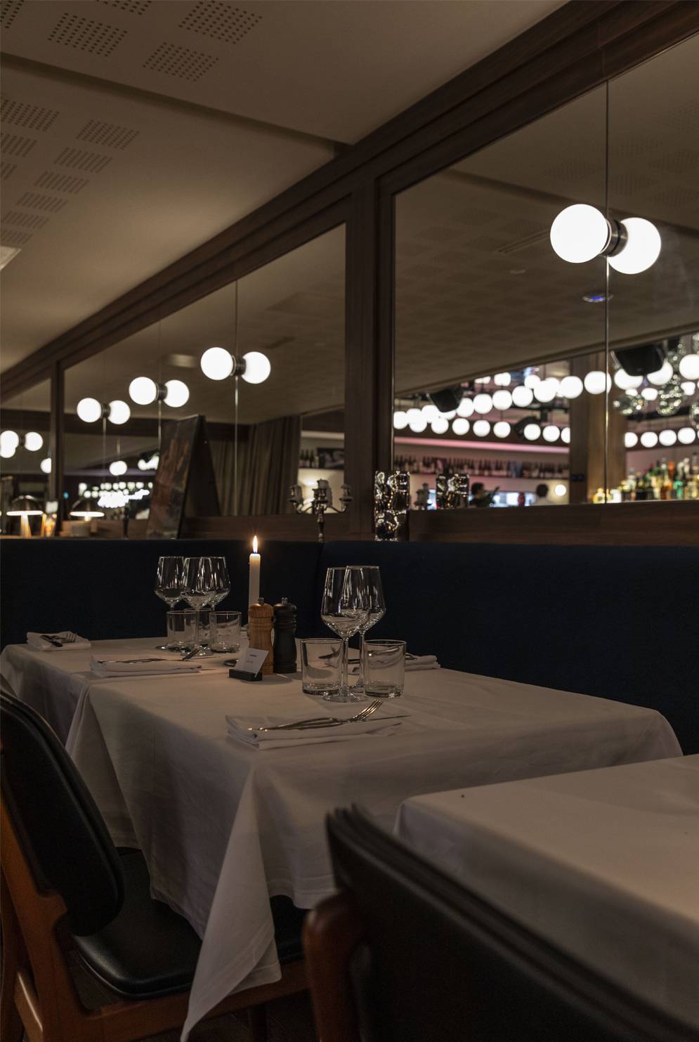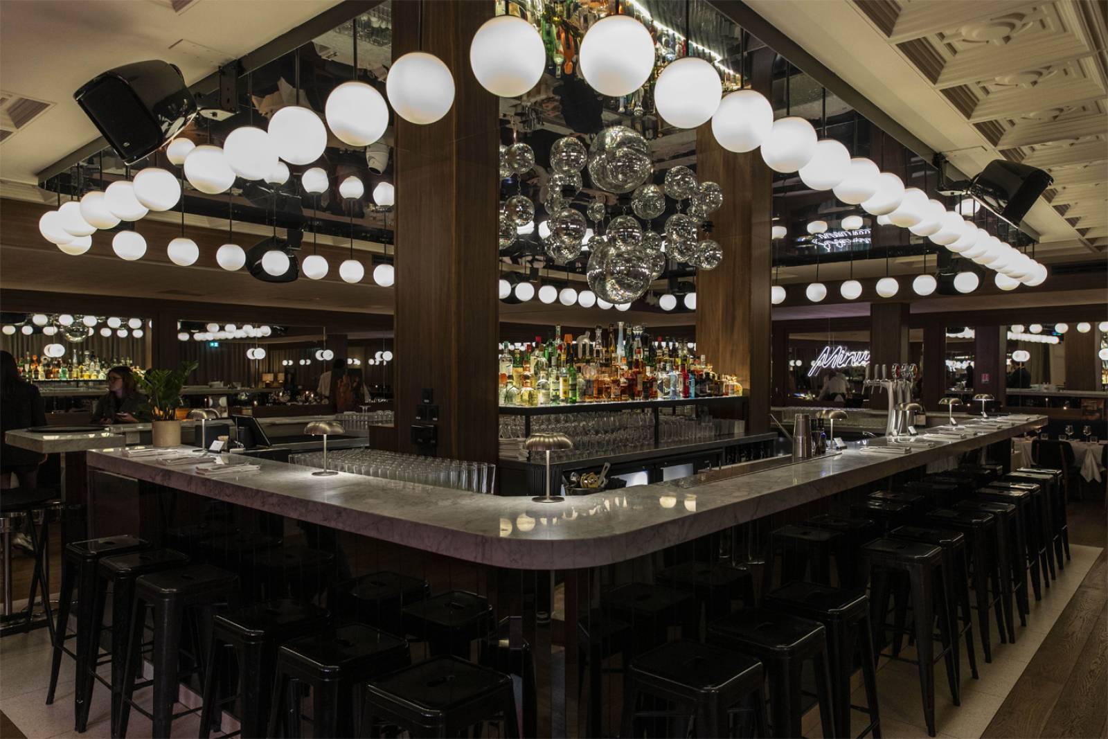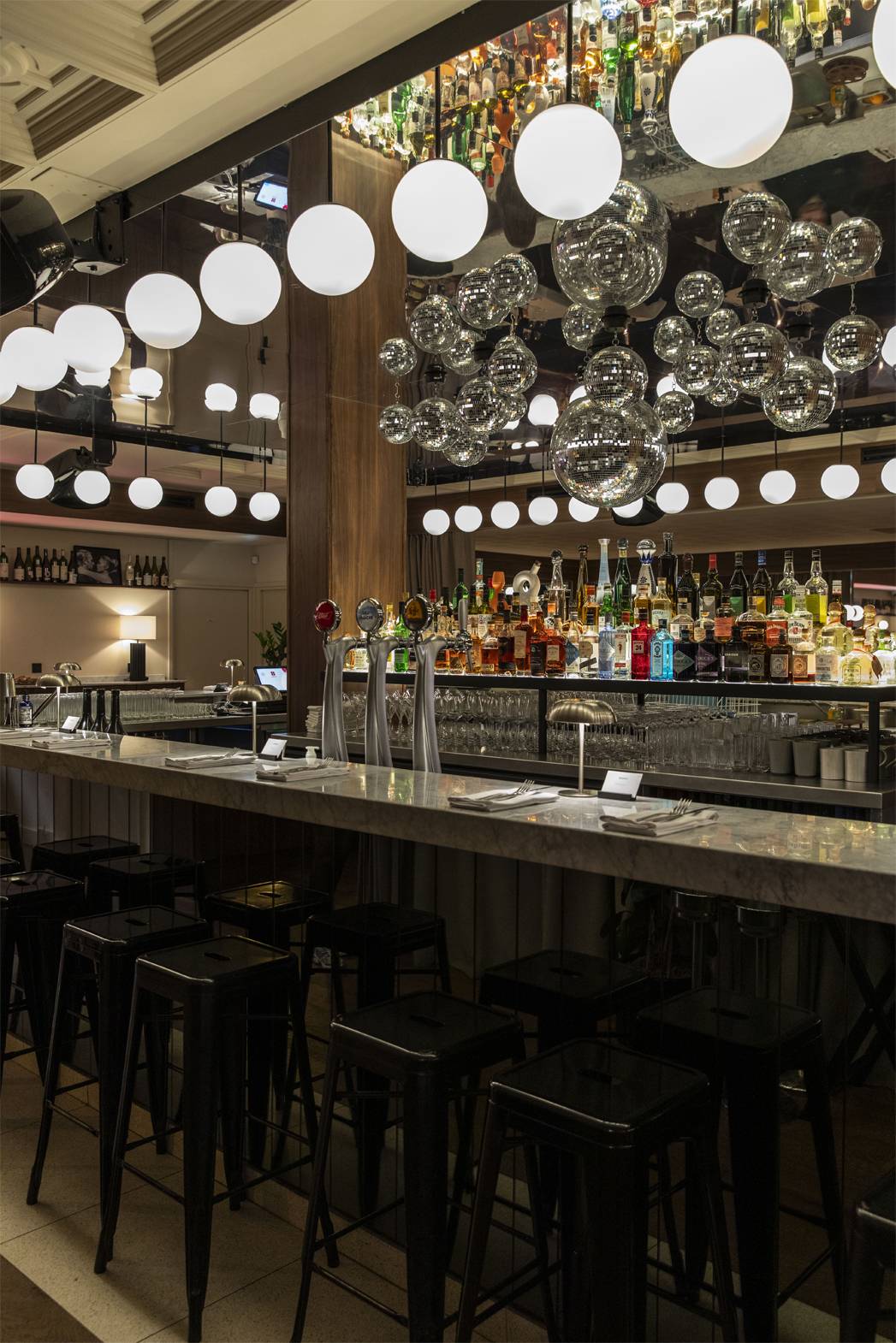 Pensé comme un décor en constante évolution, l’intérieur joue avec les contrastes : bois sombres, marbres précieux, jeux de lumière, murs clairs rafraîchissants et une variété de miroirs composent une ambiance à la fois élégante, chic et sensuelle. Au cœur de l’espace, un bar monumental trône sous une grappe spectaculaire de boules à facettes, suspendue sous un plafond miroir qui démultiplie les reflets et accentue la théâtralité du lieu.