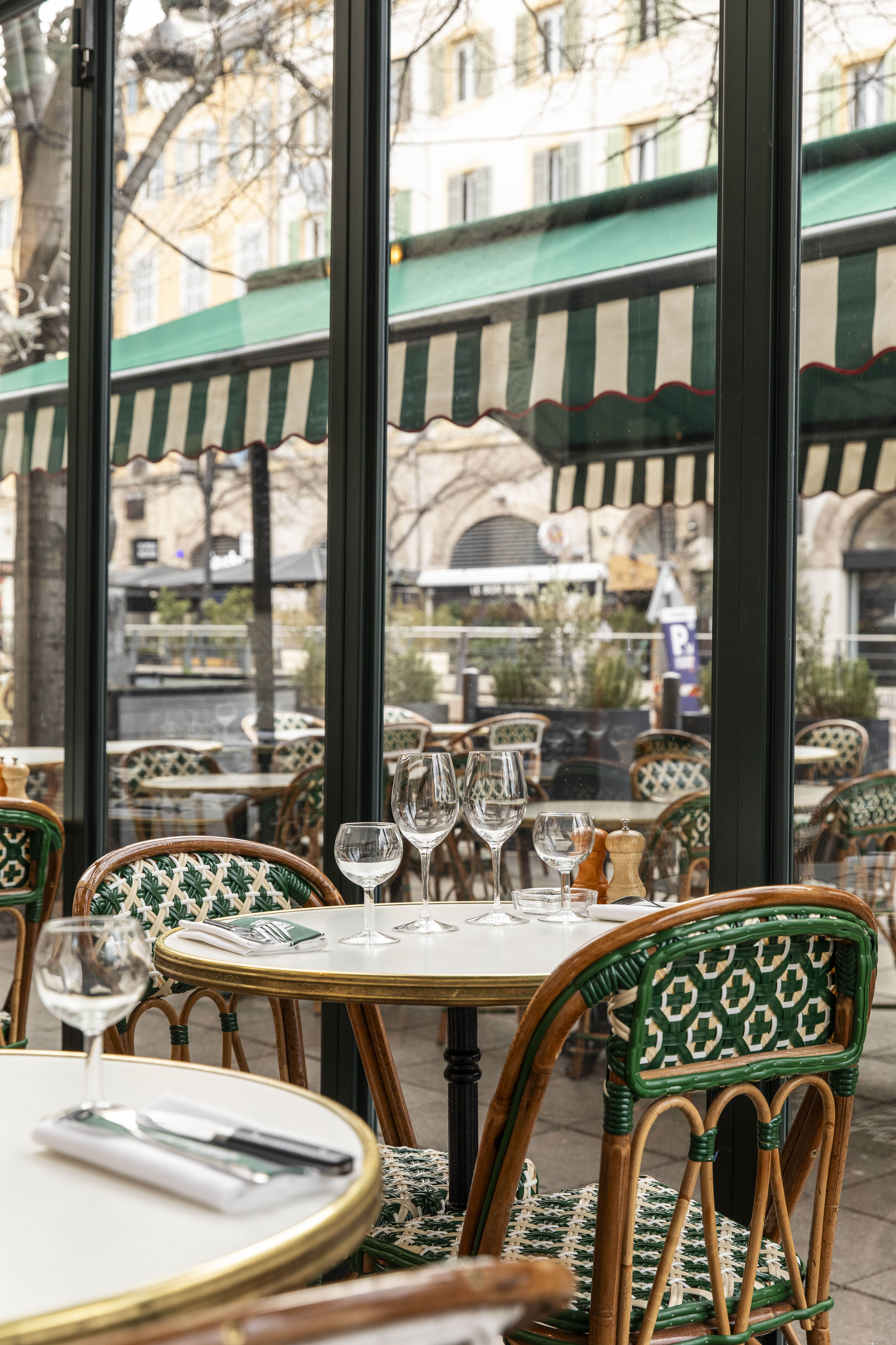 Située à l’angle de la place aux Huiles et de la rue Saint-Saëns, la réhabilitation complète de la brasserie Travers et de sa véranda a permis de révéler tout le potentiel de ce lieu emblématique. Visible depuis la rue grâce à sa toile rayée verte et blanche et sa structure en fer forgé toute en transparence, la façade invite à découvrir un univers à la fois frais, dynamique et chaleureux.