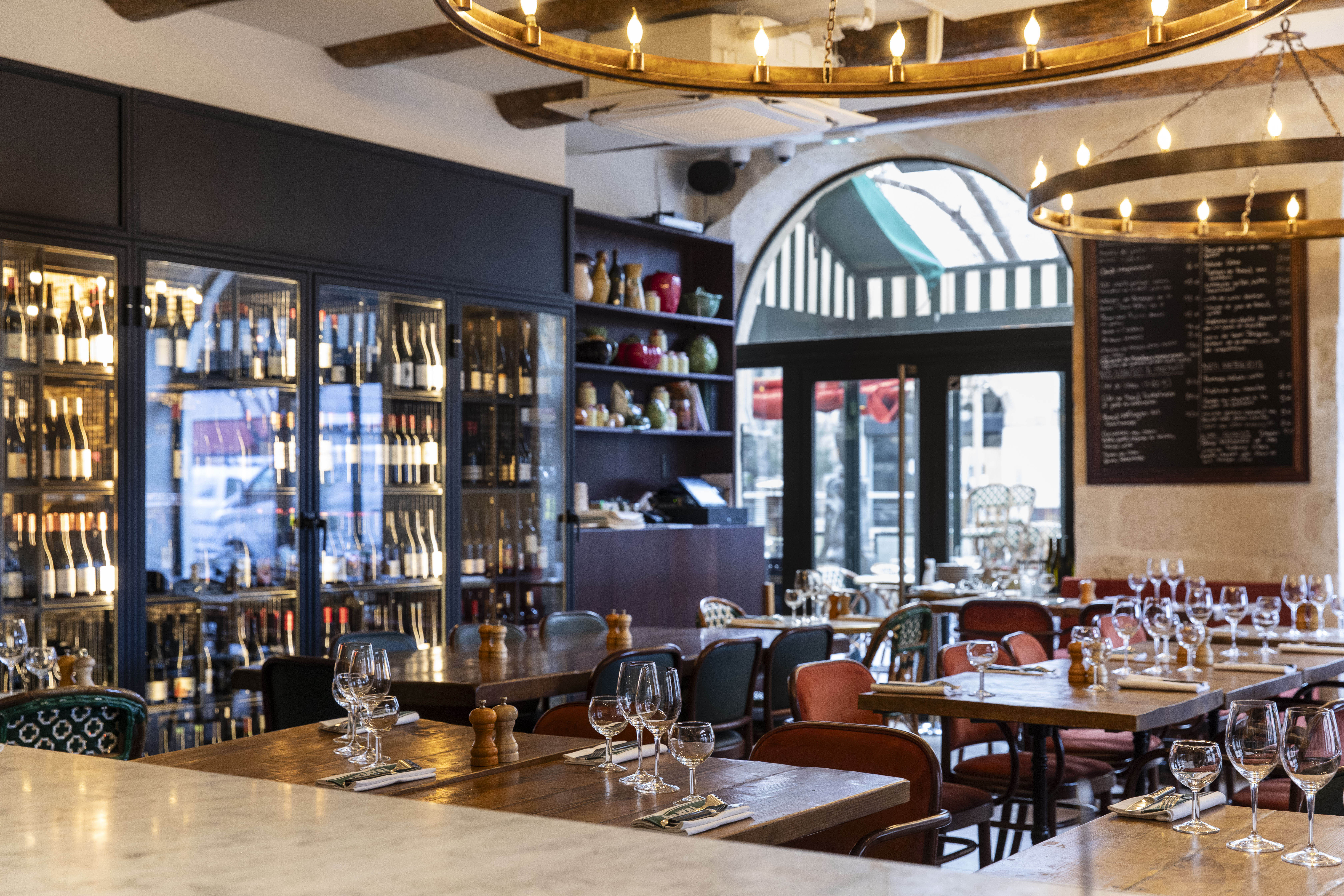 À l’arrière, une cuisine optimisée assure le rythme intense des services, tandis que la terrasse extérieure mêle rotin, appliques en fer forgé, plateaux en céramique et pieds en fonte, pour prolonger cette atmosphère unique.