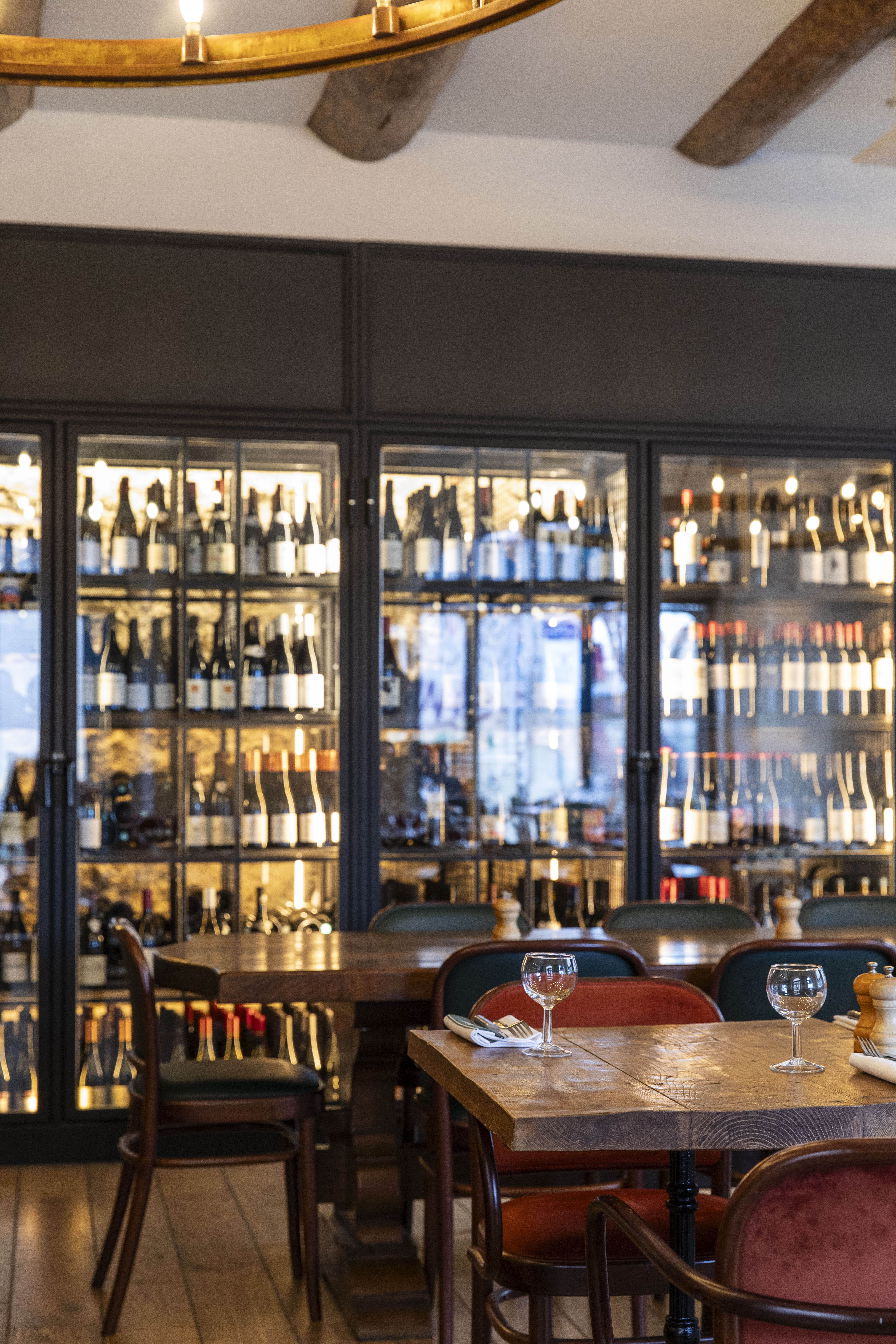 À l’intérieur, les matériaux bruts et existants sont sublimés : les poutres apparentes du plancher à la française, un parquet chaleureux, et une pierre finement décroutée et mise en lumière rythment les espaces avec authenticité. Une cave à vin sur mesure de plus de 8 mètres, en fer forgé, équipée d’un double système de température pour vins blancs et rouges, apporte caractère et fonctionnalité.